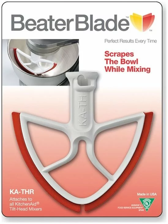 BeaterBlade is a revolutionary kitchen tool for your KitchenAid stand mixer. It scrapes, beats, folds, and mixes 100% of the ingredients with consistency every time. You simply add ingredients on the left side of the bowl, facing the machine, aiming for the center of the bowl and the beaterblade does the rest. This system virtually eliminates hand-scraping and food build-up on the sides and bottom of the bowl. After you finish mixing the BeaterBlade can still be used as a spatula.