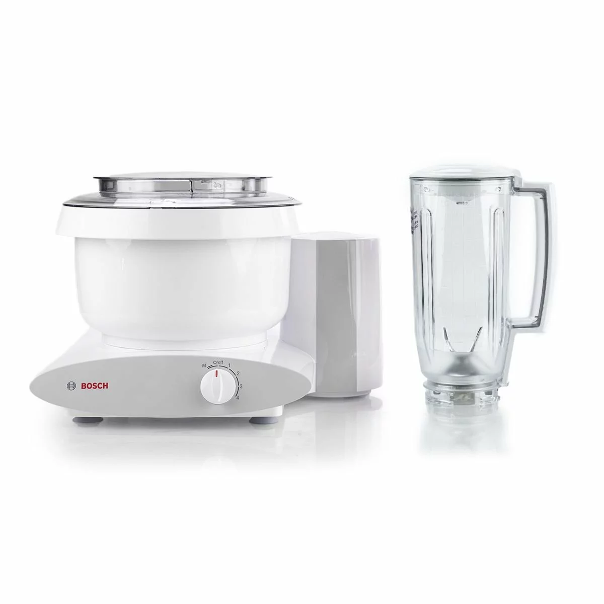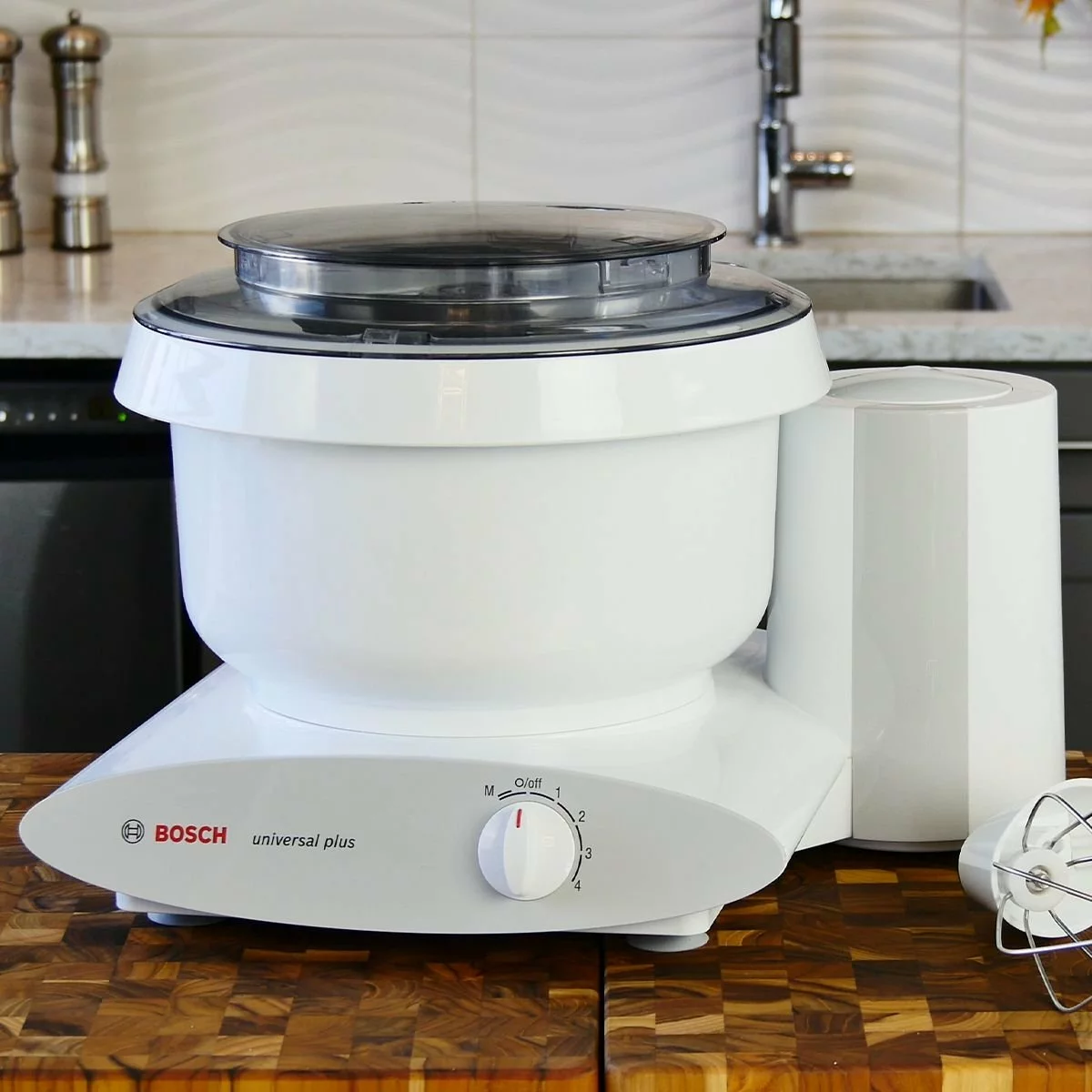 With the Bosch Universal Plus Mixer + Blender Attachment, you’ll have all the tools you need to effortlessly slice, shred, and mix ingredients for your favorite recipes! With a powerful 500-watt motor and a generous 6.5-quart bowl, this mixer is equipped to mix up to 15 pounds of thick bread (including whole wheat) or pizza dough, as well as 34 dozen cookies in a single batch. Uniquely designed with the motor beneath the bowl and suction feet to keep it stable while mixing, this powerhouse appliance features four-speed options and a pulse option for mixing, blending, and combining ingredients to your recipe’s exact preference. This mixer comes with dual wire whips that allow you to whip hefty batches of cream and as little as one egg white at a time, a stainless steel heavy-duty dough hook that’s designed to mimic the motions of hand-kneading to stretch, tuck, & fold the dough for maximum gluten development, and a bowl cover that can be used while the mixer is running to keep dry & wet ingredients from splashing out of the bowl.