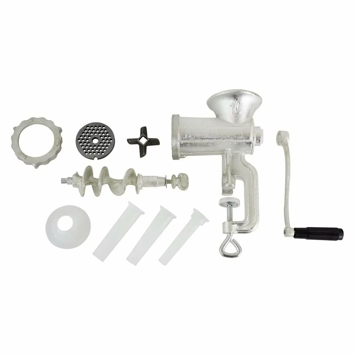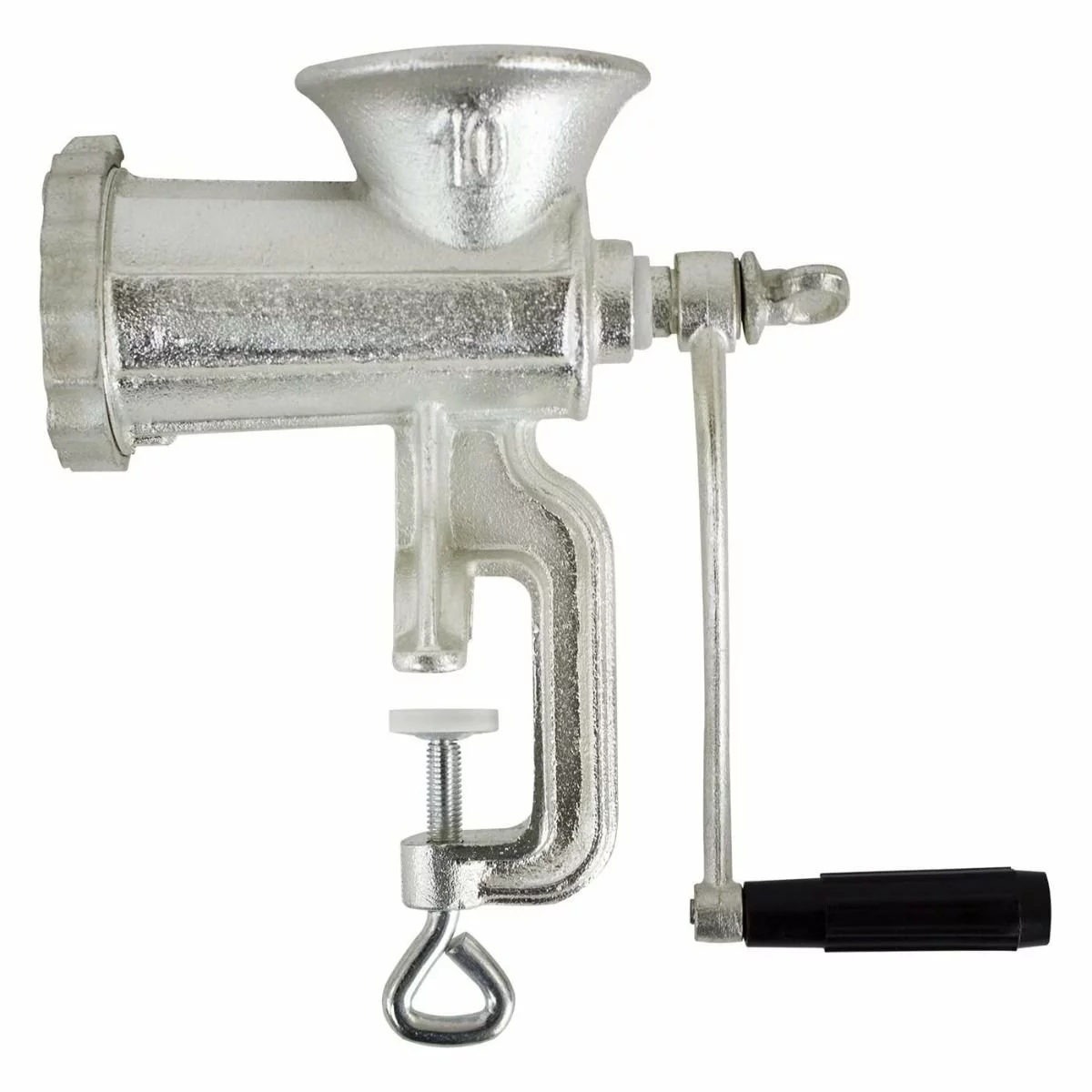 The Chard #10 Hand Grinder is the perfect hand crank meat grinder for making hamburgers, jerky, or sausage. The heavy-duty, tin-coated cast iron construction ensures years of continuous use. Grind generous portions of meat quickly with the 2 3/4” diameter grinding head and 1/4” grinding plate. Rubber clamp pads protect your work surface and the table clamp style attaches to any countertop up to 1 1/2” thick. The oversized thumb screw easily attaches or removes the poly handle which is easier to clean and won’t split or splinter. Fully disassembles for quick and easy clean-up.