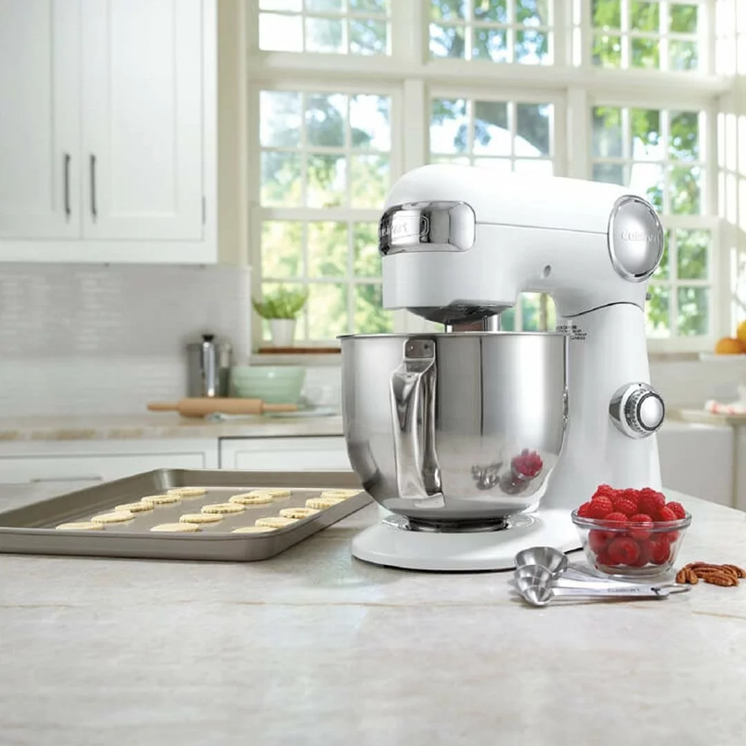 The durable die-cast metal construction can hold up to daily use. Included with the stand mixer are a chef’s whisk for whipping eggs, flour, sugar, and other baking staples, a dough hook that saves time by replacing the need for hand-kneading cookie doughs and bread yeasts, and a flat mixing paddle that blends frosting and dips to a smooth consistency. It’s also equipped with one power outlet for attaching optional attachments (sold separately) like their pasta roller attachment, meat grinder attachment, or frozen dessert maker to turn your stand mixer into a versatile powerhouse appliance! Cuisinart’s Precision Master Stand Mixer is excellent for keeping up with large projects or for family baking fun!