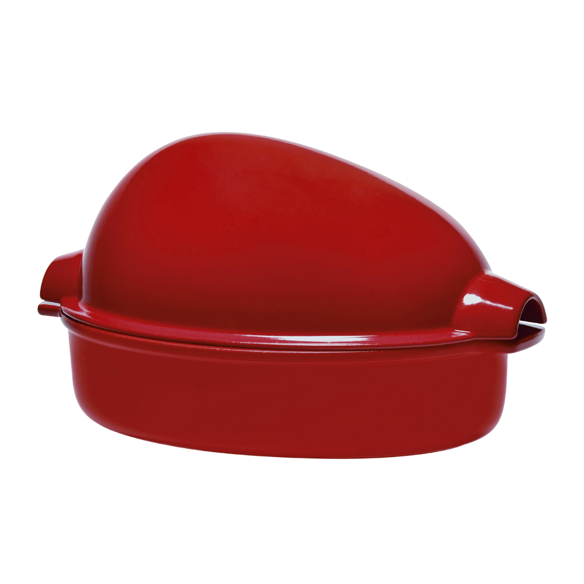 Roast Thanksgiving turkey, holiday ham, vegetables, and more with the Emile Henry Large Roaster in Burgundy. This beautiful, high-quality roaster is made of Emile Henry’s refractory ceramic that undergoes an exclusive firing process, resulting in strong, durable bakeware that can withstand years of use. This roaster includes a sturdy ceramic lid that’ll lock in steam and circulate heat, resulting in evenly browned meats that are moist and tender with each use. This roaster is ideal for cooking whole birds, meats, and vegetables, and has a beautiful glazed finish that’ll allow you to serve food right in the dish for an elegant presentation. For special occasions and casual dinners alike, try the Emile Henry Large Roaster today!