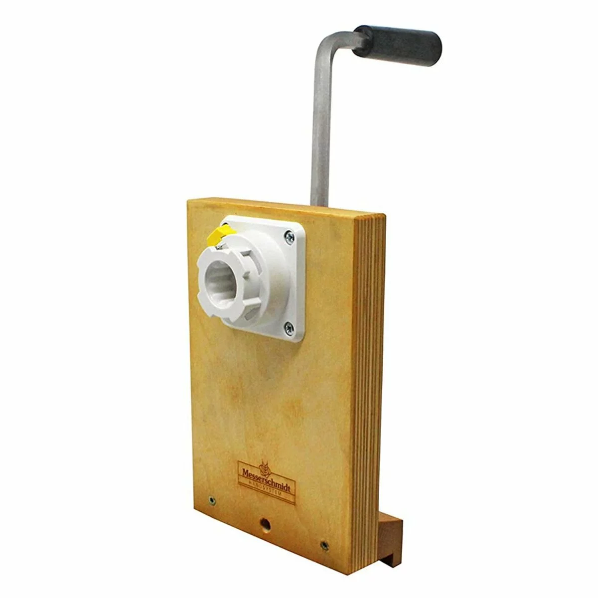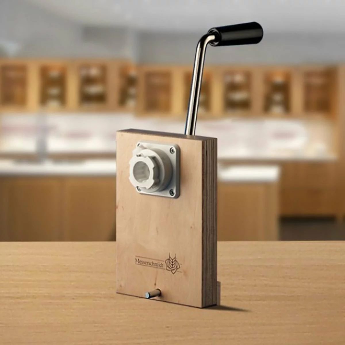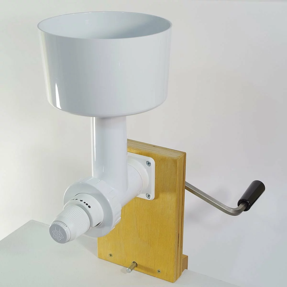 No electricity, no problem! With the Family Grain Mill Hand Drive Unit you can run all of the Family Grain Mill attachments and grind grains or meat, juice citrus, or slice and shred ingredients whenever you need them! Made in Germany, the Hand Drive Unit is mounted on a sturdy coated wood base that securely clamps to your table or countertop without causing damage. Whether you prefer the simplicity (and quietness) of hand-powered tools or you just need to prep food while camping or during a power outage, the durable iron handle turns attachment mechanisms and keeps your meal preparations on track.