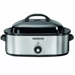 The Proctor Silex Electric Turkey Roasting Oven has a capacity of 18 quarts and is able to roast / cook / bake / warm meat, poultry, and seafood dishes up to the size of a 24 lb turkey. This durable stainless-steel large roaster oven has an adjustable temperature range of 150°–450° F. A heavy-duty domed lid helps to retain heat and moisture while roasting to give your turkey, chicken, or pot roast a juicy and delectable texture.