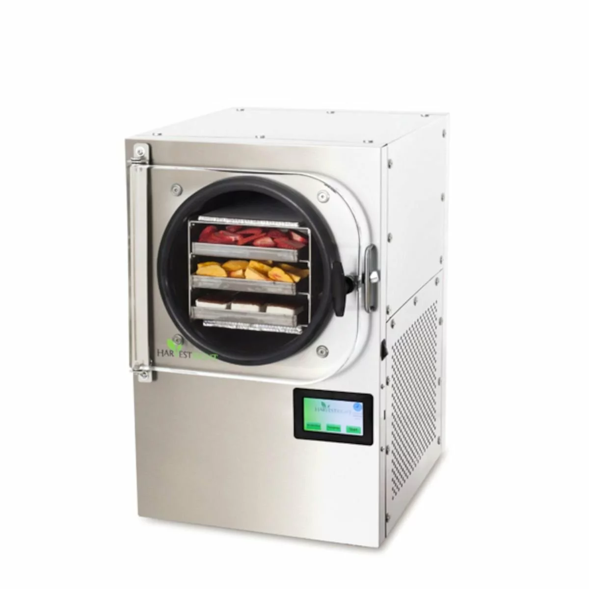 Explore a whole new way of preserving food that maintains taste, aroma, appearance, and nutrition with your new Harvest Right Small Size Home Freeze Dryer! This freeze dryer includes a commercial grade vacuum pump, four stainless steel trays, one oil filter, an insulator door pad, a 110V power cord, an owner’s manual, a mylar starter kit of 50 mylar bags, a mylar bag sealer, and 50 oxygen absorbers, and a guide to freeze-drying. This compact freeze dryer fits nicely on a countertop, cart or table making this ideal for a home setting.