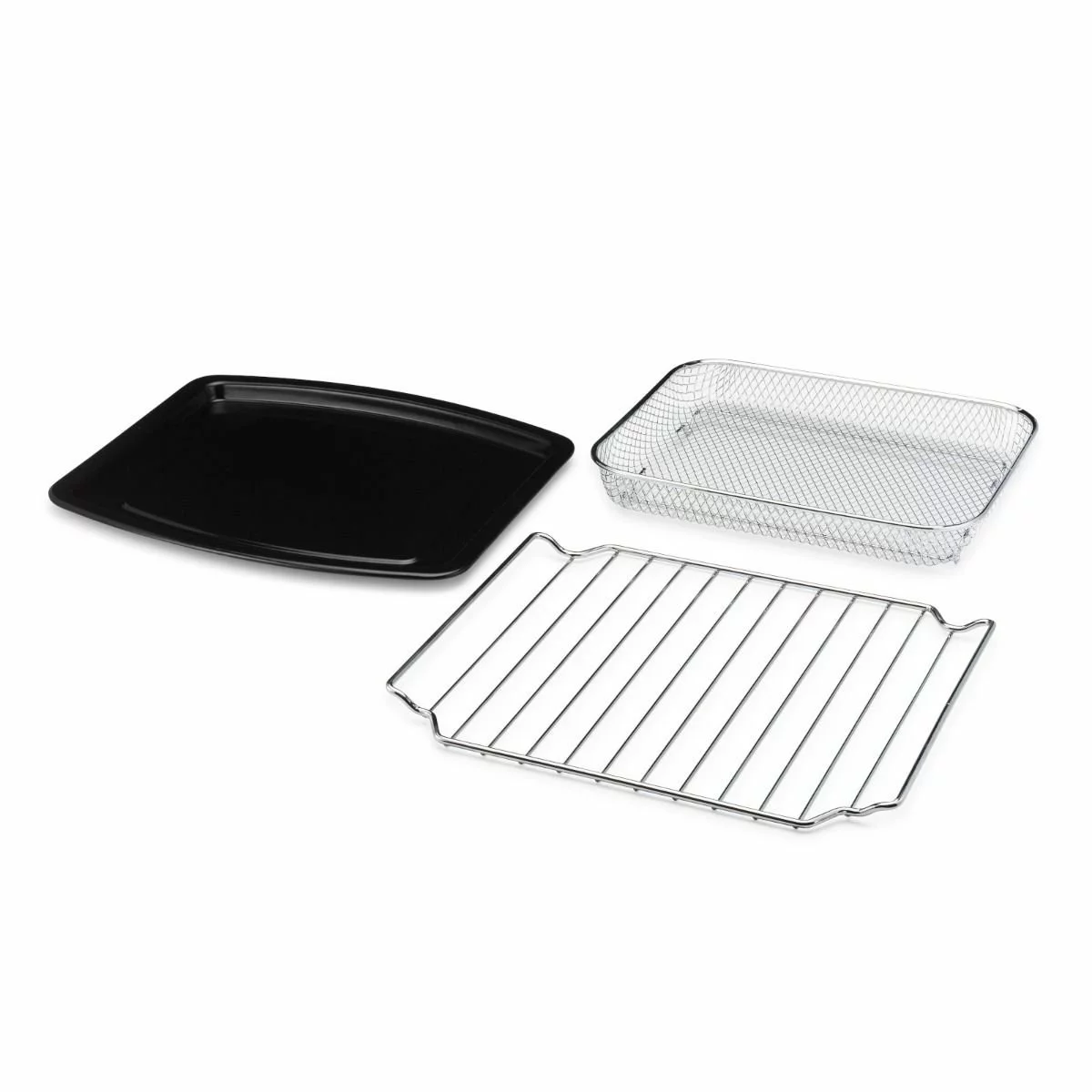 - Included are an enamel baking tray, a stainless steel oven rack, and an air fry basket