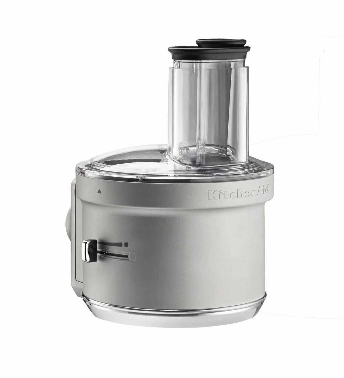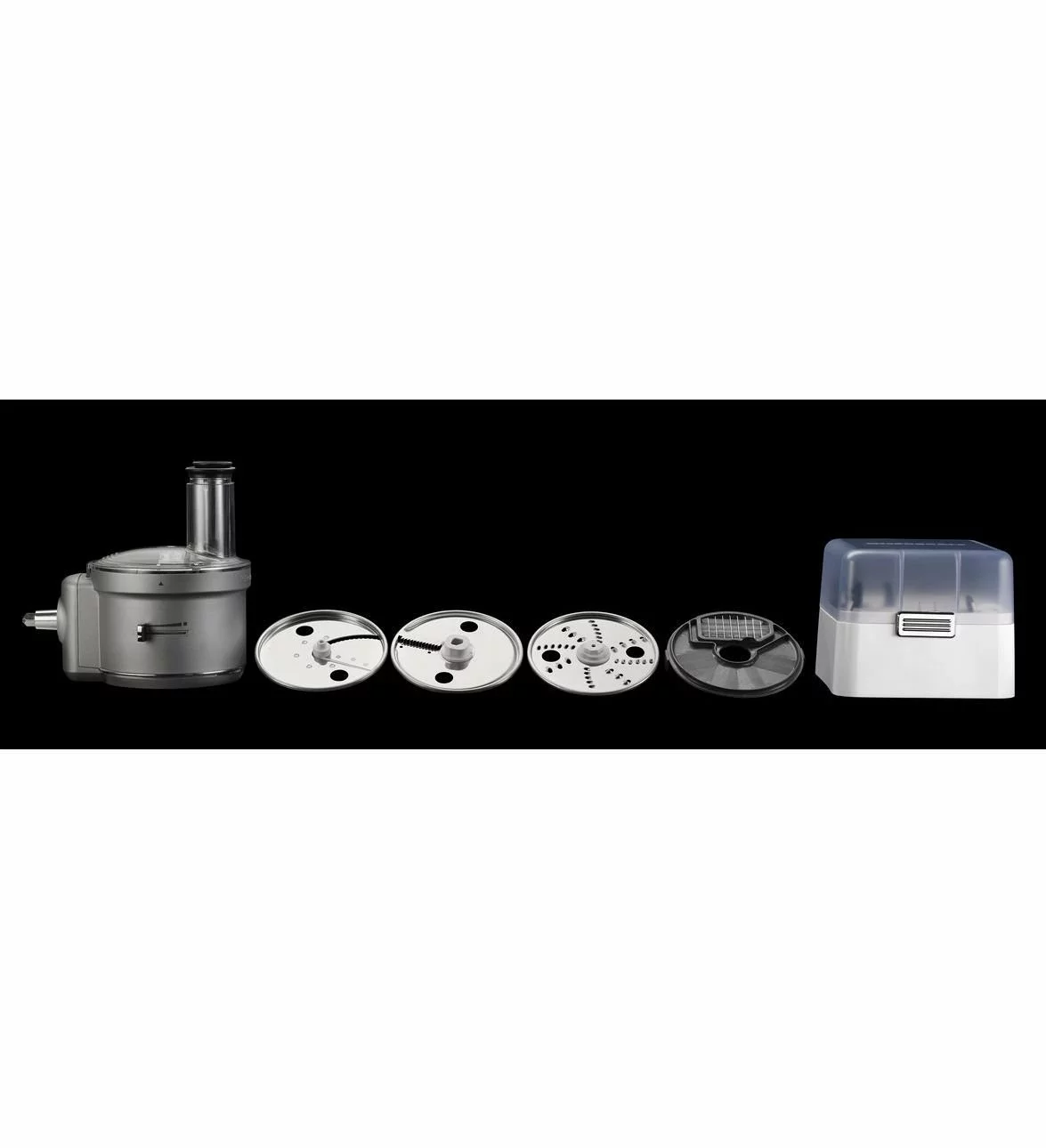 The beauty of a Kitchen Aid stand mixer is the ability to multi-task using one appliance! And KitchenAid again expands your culinary capabilities with this ExactSlice Food Processor Attachment for Stand Mixers, both tilt-head and bowl-lift models. The KitchenAid ExactSlice System allows you to change slicing from thick to thin with one slide of the exterior lever. That is pure convenience and simplicity! No changing discs during slicing to fit your needs. This KitchenAid mixer attachment includes four discs, a grating disc, a slicing disc, julienne disc and dicing kit. This combination makes the food processor package perfect for so many needs. So multi-task away in the kitchen with the Exactslice Food Processor Stand Mixer Attachment. Kitchen Aid helps you make better, more beautiful food quickly and easily!