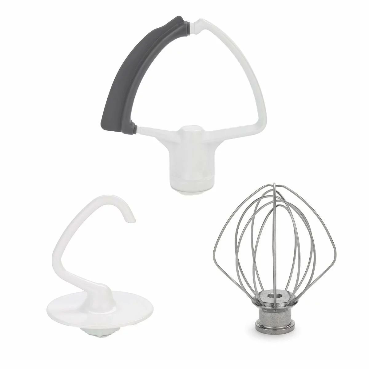 This set includes the KitchenAid 3.5-Quart Flex Edge Beater, KitchenAid 3.5-Quart Coated Dough Hook, and KitchenAid 3.5-Quart Wire Whip. All three accessories will give your Artisan Mini Stand Mixer more range for different mixtures! With the KitchenAid 3.5-Quart Flex Beater, you will be able to whip up creamy nut butters, homemade honey, velvety cream cheese, and other tasty mixtures in perfect portions and convenient sizes. The silicone flex edge scrapes smoothly across the sides of the mixing bowl, which is ideal for thoroughly beating heavy materials such as butter into a flour base. As far as making dough, the KitchenAid 3.5-Quart Coated Dough Hook is coated with a nylon finish that glides effortlessly through thick dough for thorough mixing and easy release, and it is easily detachable for dishwasher use! Finally, the KitchenAid 3.5-Quart Burnished Aluminum Wire Whip has a 6-wire construction that assimilates air to fluff up whipped cream, pancake batter, whisk away eggs, and more!