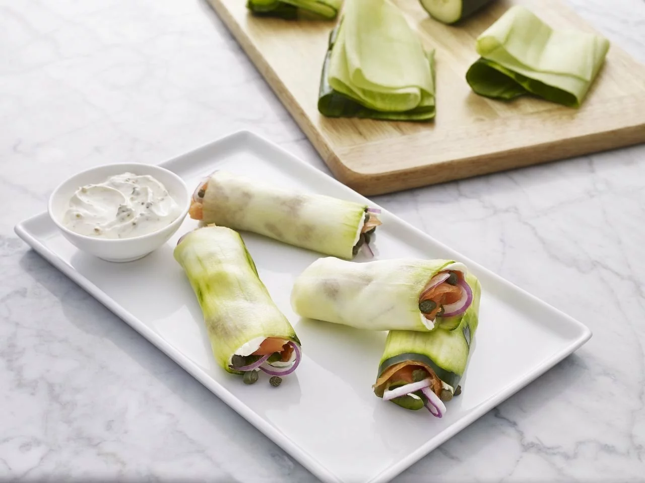 Place one zucchini sheet on a clean work surface. Spread about 2-3 tablespoons of filling in an even layer on each sheet, then roll, starting with the short end closest to you.