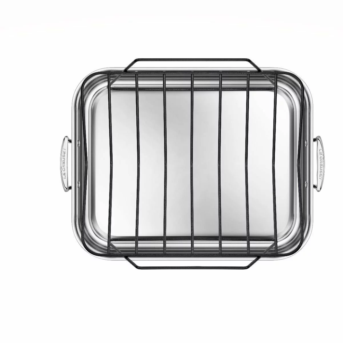 Prepare a succulent, juicy turkey for your family with Le Creuset’s Stainless Steel Roasting Pan with Nonstick Rack. This 16.25” by 13.25” pan features a durable & thick stainless steel construction ensuring the exterior is resistant to scorching, pitting and discoloration. The ergonomic handles are hollow providing a comfortable grip and reduction of heat transfer when transferring the pan to and from the oven. The precision pour rim is rolled, sealed and polished and makes pouring clean and dripless. The nonstick rack ensures a perfect turkey every time. Impress your family and friends with your culinary skills with Le Creuset’s Stainless Steel Roasting Pan.