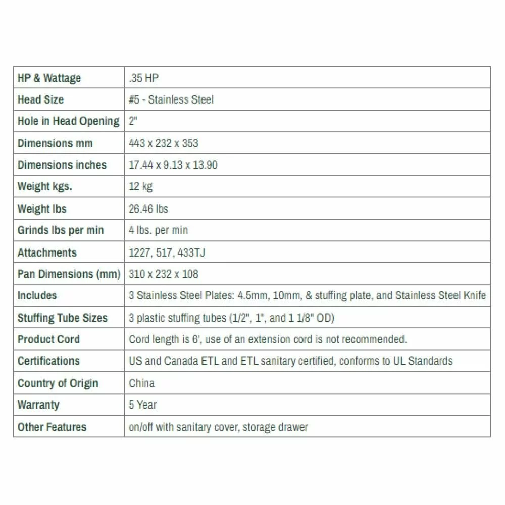 When it’s time to step up from an average kitchen grinder, it’s time for the LEM Big Bite Meat Grinder #5 17771-LEM. This LEM meat grinder is a .35-HP version of its large 1.5 HP grinder, and is upgraded and improved with a rifled head; large-diameter, offset throat; quieter gears; and refined performance overall. Designed for smaller grinding tasks, this electric meat grinder grinds about four pounds of meat per minute. Features include a stainless steel motor housing, all metal gears with roller bearings, a built-in circuit breaker, and a .35-HP induction motor that is permanently lubricated for quiet operation. LEM’s exclusive Big Bite Technology allows the grinder’s auger to grab large chunks of meat and quickly feed them to the grinder head for a superior grind in record time. The rifled head design initiates an enhanced second grind to practically eliminate stomping and improve sausage stuffing. Everything you need to grind beef, pork, and wild game comes with the LEM Big Bite Meat Grinder, including a meat stomper, knife, stuffing plate, two grinding plates, three stuffing tubes, and a large meat pan. As part of this bundle, you’ll also receive a 1/8″ grinder plate made of premium Salvinox stainless steel (useful for your hamburger, bologna, hotdogs, & jerky), as well as a 1/4″ grinder plate made of premium Salvinox stainless steel (ideal for your coarse sausages like summer, salami, pepperoni, & snack sticks). LEM covers its improved #5 meat grinder with a 5-year warranty and provides lifetime customer support, so you’re guaranteed to be grinding meat for sausage, jerky, burgers, and more for years to come.
