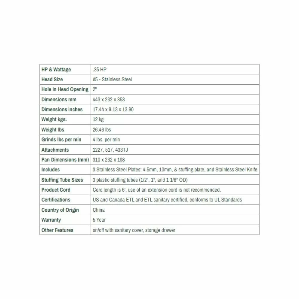 - Includes: meat stomper, stainless steel knife, stuffing plate, 2 stainless steel plates (3/8” coarse, 3/16” fine), 3 stuffing tubes (1/2″, 1″, 1-1/8″ OD), large meat pan