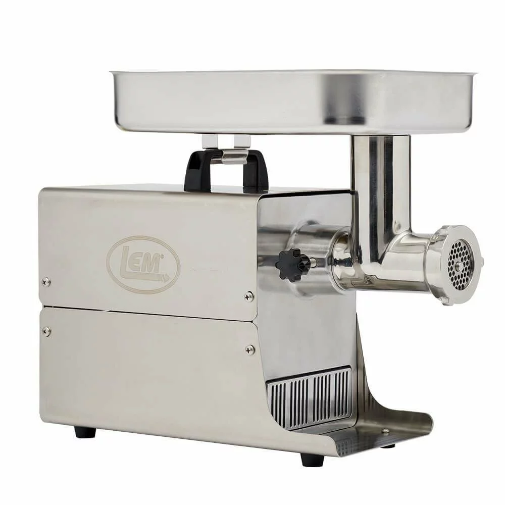When it’s time to step up from an average kitchen grinder, it’s time for the LEM Big Bite Meat Grinder #5 17771-LEM. This LEM meat grinder is a .35-HP version of its large 1.5 HP grinder, and is upgraded and improved with a rifled head; large-diameter, offset throat; quieter gears; and refined performance overall. Designed for smaller grinding tasks, this electric meat grinder grinds about four pounds of meat per minute. Features include a stainless steel motor housing, all-metal gears with roller bearings, a built-in circuit breaker, and a .35-HP induction motor that is permanently lubricated for quiet operation. LEM’s exclusive Big Bite Technology allows the grinder’s auger to grab large chunks of meat and quickly feed them to the grinder head for a superior grind in record time. The rifled head design initiates an enhanced second grind to practically eliminate stomping and improve sausage stuffing. Everything you need to grind beef, pork, and wild game comes with the LEM Big Bite Meat Grinder, including a meat stomper, knife, stuffing plate, two grinding plates, three stuffing tubes and a large meat pan. LEM covers its improved #5 meat grinder with a 5-year warranty and provides lifetime customer support, so you’re guaranteed to be grinding meat for sausage, jerky, burgers, and more for years to come.