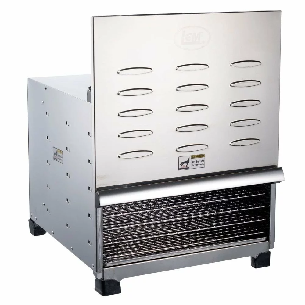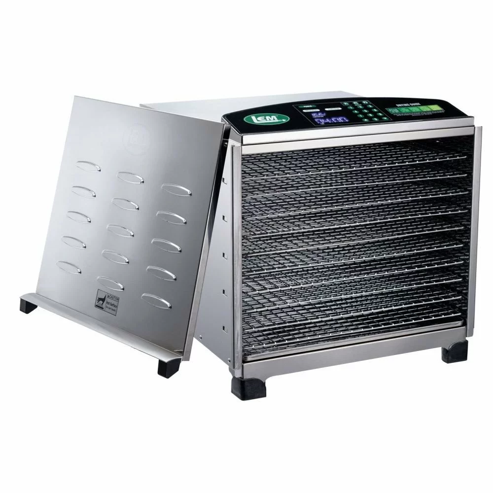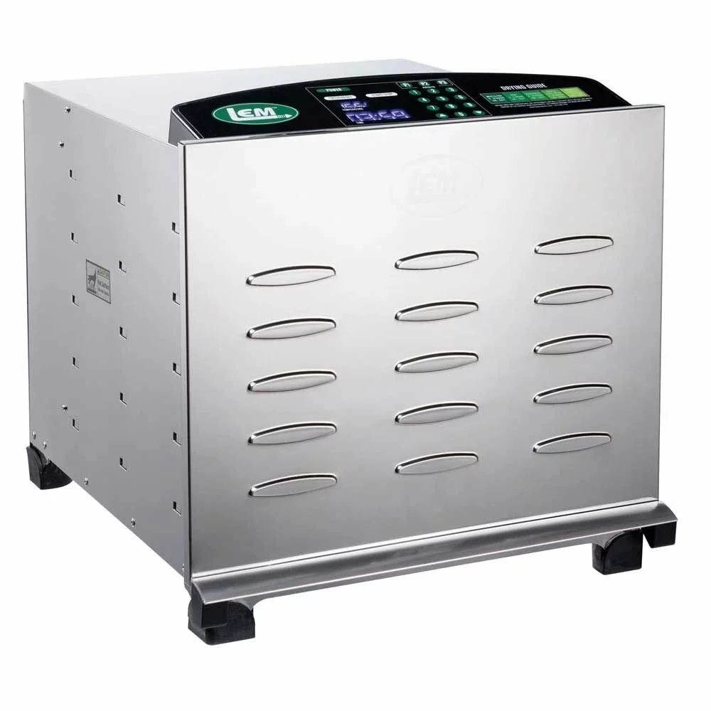 Make delicious dehydrated fruits, veggies, or jerky with the Digital Dehydrator from LEM. This model comes with 10 chrome-plated trays that have a 16 ft.2 surface area for drying. The trays have 1/4″ holes, meaning they can hold the smallest of fruits, veggies, or herbs. The ingenious door design is patent pending, and features a magnet locking mechanism that allows you to monitor your food with minimal heat loss. The horizontal air flow system with the rear-mounted fan assures uniform drying. There is also a 24-hour timer with an auto-shutoff feature. The digital display lets you choose between 3 customizable preset temperature controls as well. With this dehydrator, the only difficult part of the process is eating the mountain of dried food you’ll make! For the best in dehydration, go with LEM!