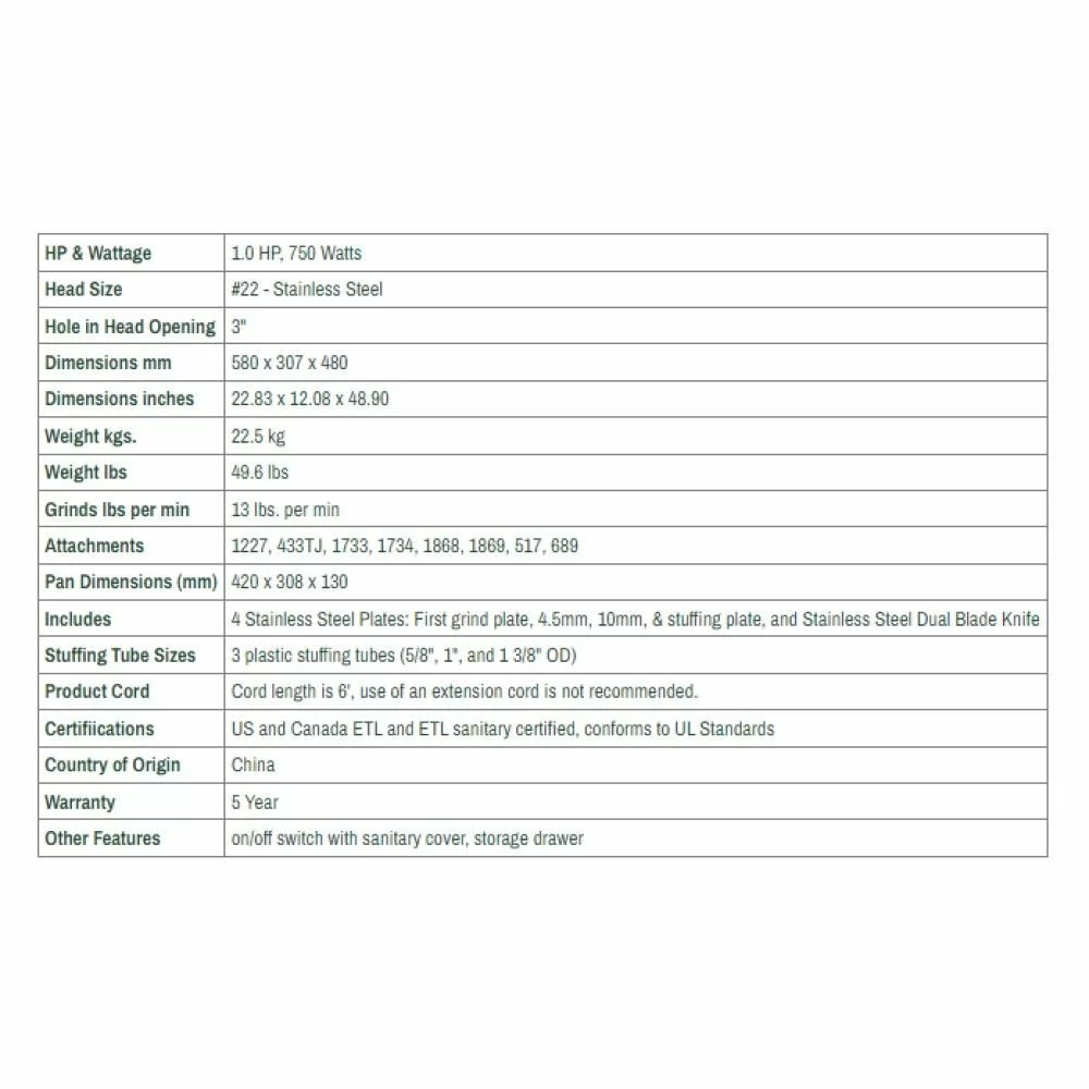 - Stainless steel motor housing base, storage drawer, grinder head, augur, plates, dual blade knife, augur puller & meat pan