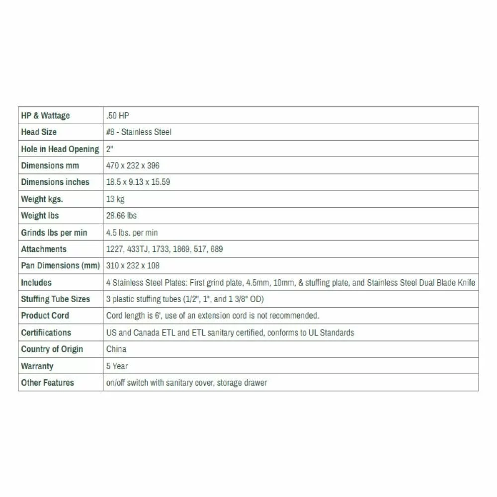 LEM Dual Grind #8 Big Bite Meat Grinder (0.5 HP) Includes: