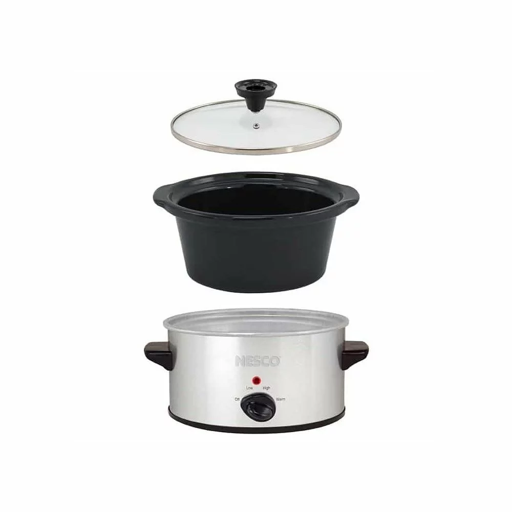 The NESCO 1.5 Qt. Slow Cooker in Stainless Steel makes mealtime and entertaining more flavorful. This compact slow cooker can cook delicious 1-2 person meals, appetizers, sauces and dips. Simply add your ingredients, choose your heat setting, and enjoy your family time. The removable ceramic pot is both oven and refrigerator-safe making meal prep for busy weekdays a snap. The clear tempered-glass lid lets you watch the cooking process. The stay cool handles make the unit portable allowing you to bring that delicious flavor anywhere. No matter the recipe or the occasion, the NESCO 1.5 Qt. Slow Cooker keeps the temperature steady so your food tastes great!