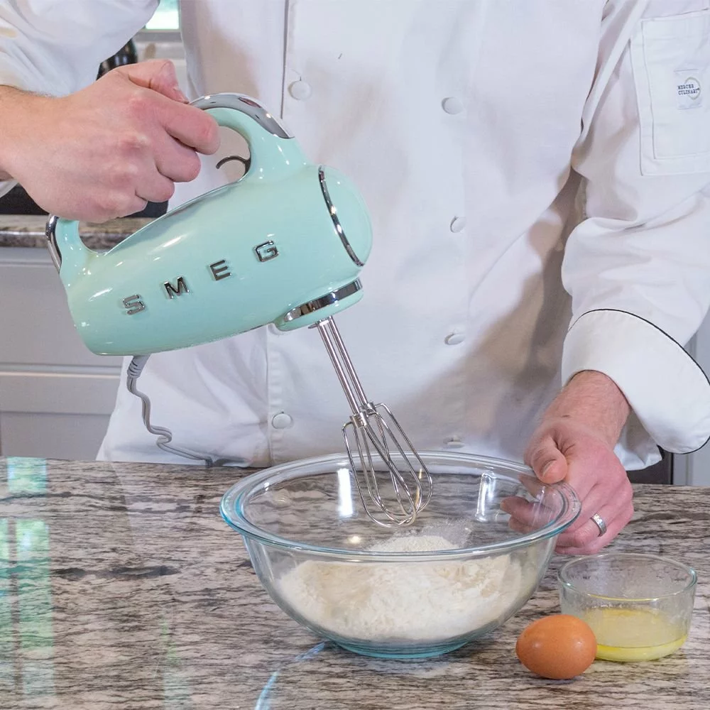 This hand mixer comes with a range of stainless steel accessories including two wire whisks that are ideal for achieving light & airy textures of whipped cream, sauces, & egg whites, two optimus flat beaters that are ideal for semi-hard doughs including biscuit dough, cookie dough, & cake batter, and two dough hooks that are capable of mixing leavened recipes including pizza & bread dough. And when you’re done whipping up your delicious recipes, the accessories come with an attractive fabric storage bag to keep them neatly stored when not in use. Whether you’re expanding your SMEG appliance collection or gifting to the baker in your life, the SMEG Hand Mixer will quickly become your favorite tool that you’ll love displaying in your kitchen almost as much as you love using!