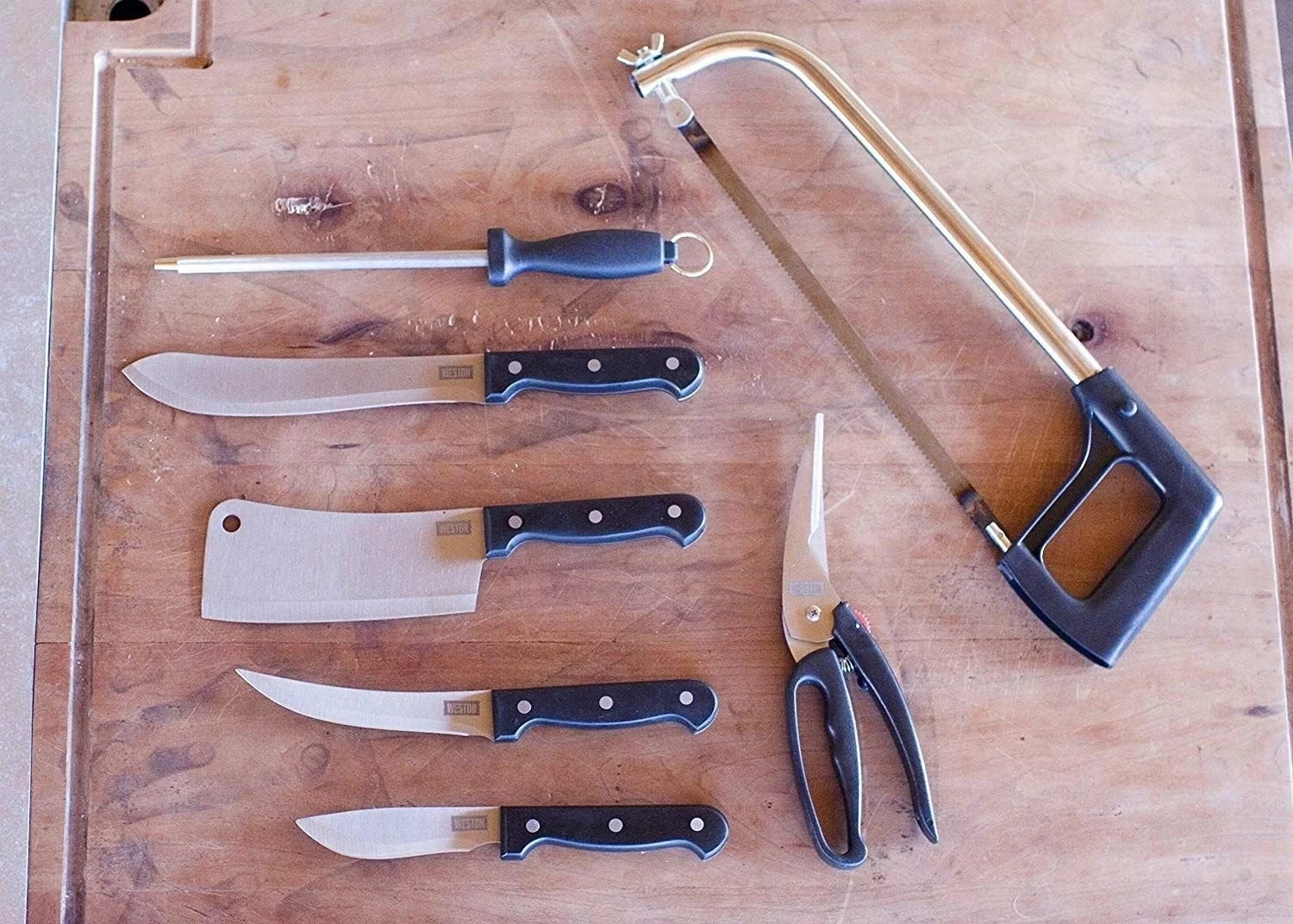 The 10-piece Weston Game-processing Set includes everything that you need to processes deer meat or other game. All of the knives in this set have durable stainless-steel blades with riveted handles and come with a strong plastic storage case so you can keep you tool safe and organized.